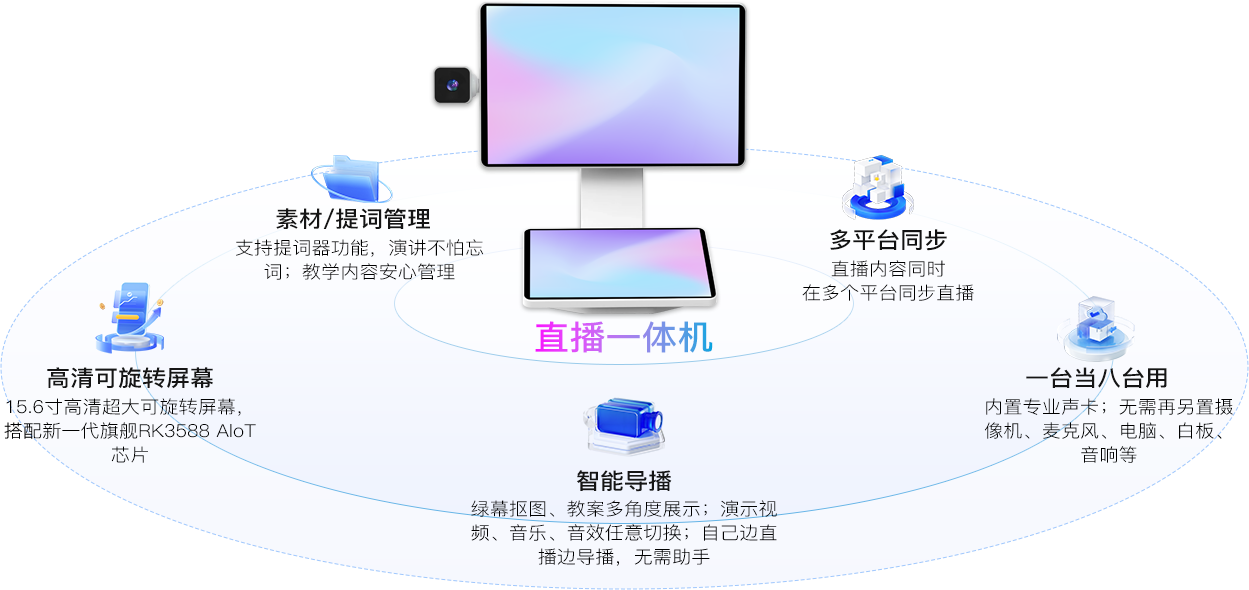 多画面切换 直播更有趣 可添加多个画面布局,不同教学内容切换不同教学画面 轻触切换机位,操作得心应手 多平台同步开讲,学生学习更方便